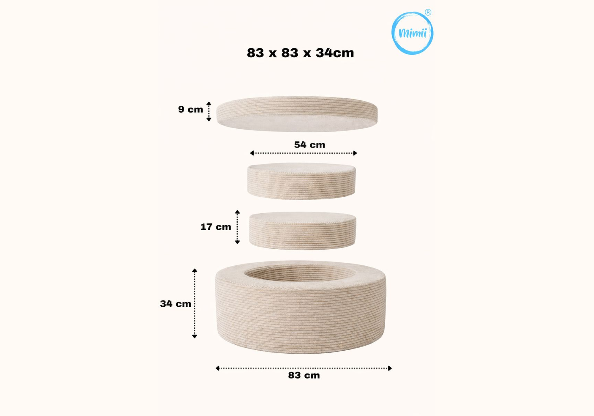 Avec ses dimensions d’environ 83 × 83 × 34 cm, ce pouf rond pour enfants s’adapte naturellement aux besoins de l’enfant à chaque étape de sa croissance. Il peut devenir un espace de jeu actif, un support pour travailler l’équilibre ou un coin calme pour se détendre et lire. Un meuble évolutif pensé pour durer.