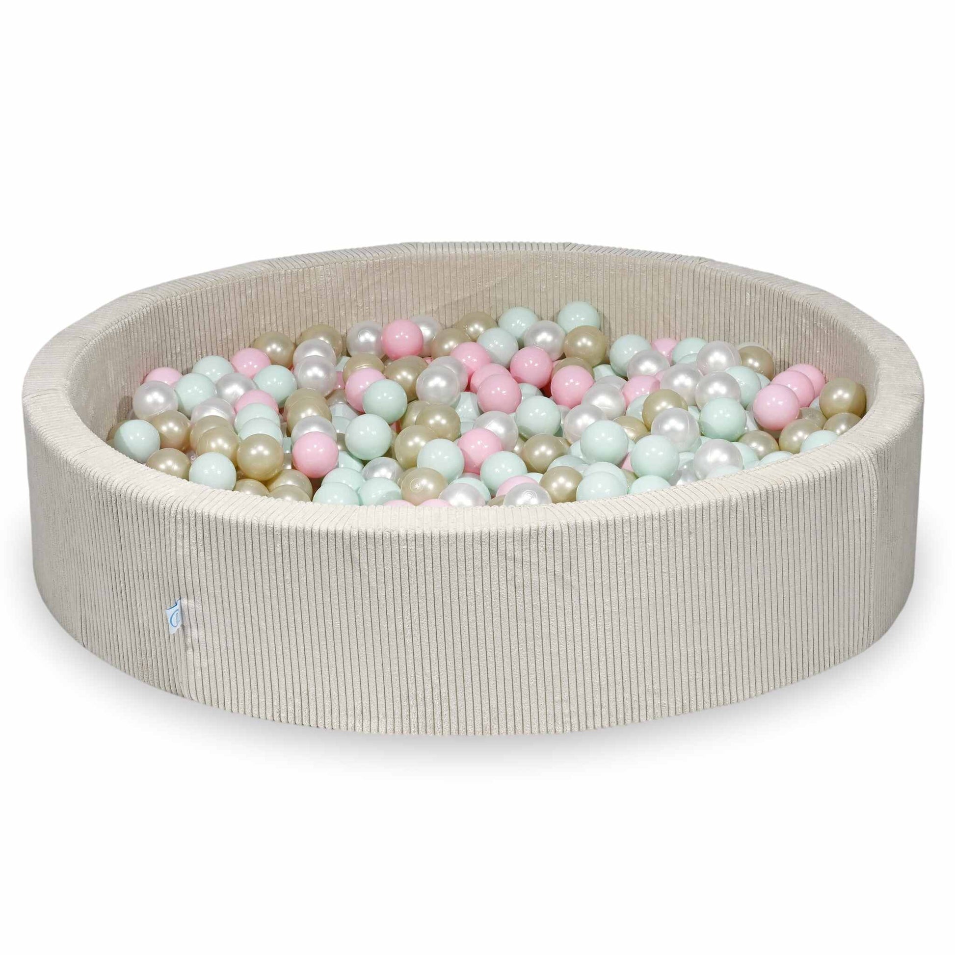 Piscine à balles ronde en velours côtelé beige, 130x30cm – Beige, 600 balls (nacrées, rose clair, vert menthe clair, or clair)