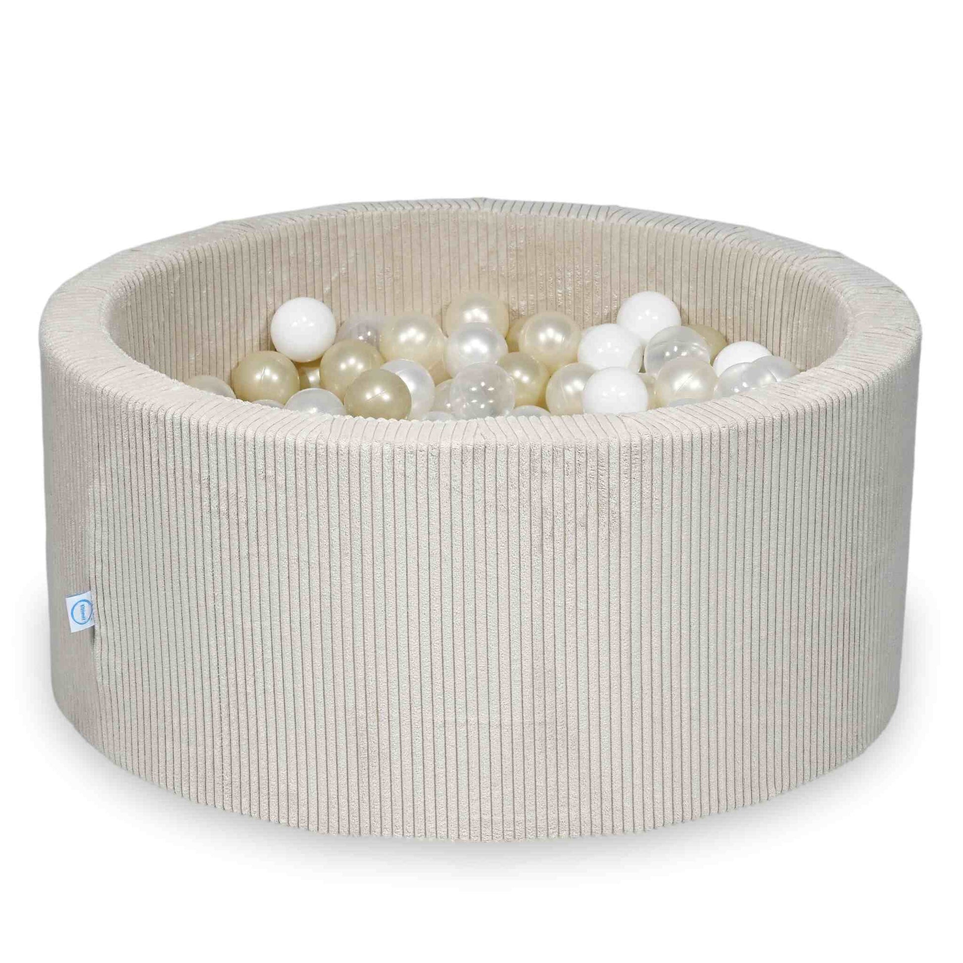 Piscine à balles ronde en velours côtelé beige, 90x40cm – Beige, 300 balls (transparentes, blanches, nacrées, or clair, irisées)