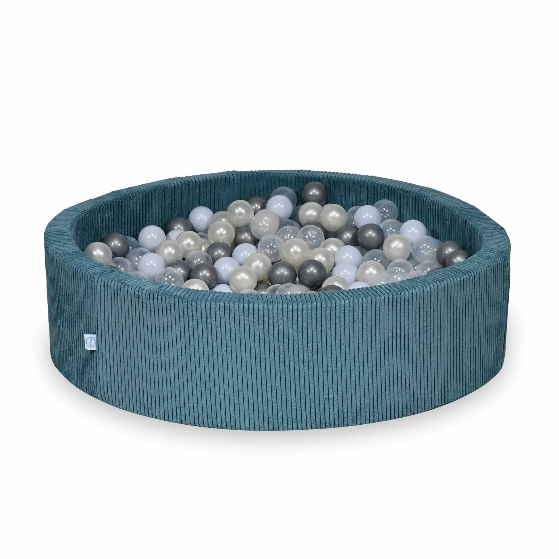 Piscine à balles ronde en velours côtelé bleu, 110x30cm – 400 balls (nacré, argenté, rose clair nacré, bleu ciel nacré)
