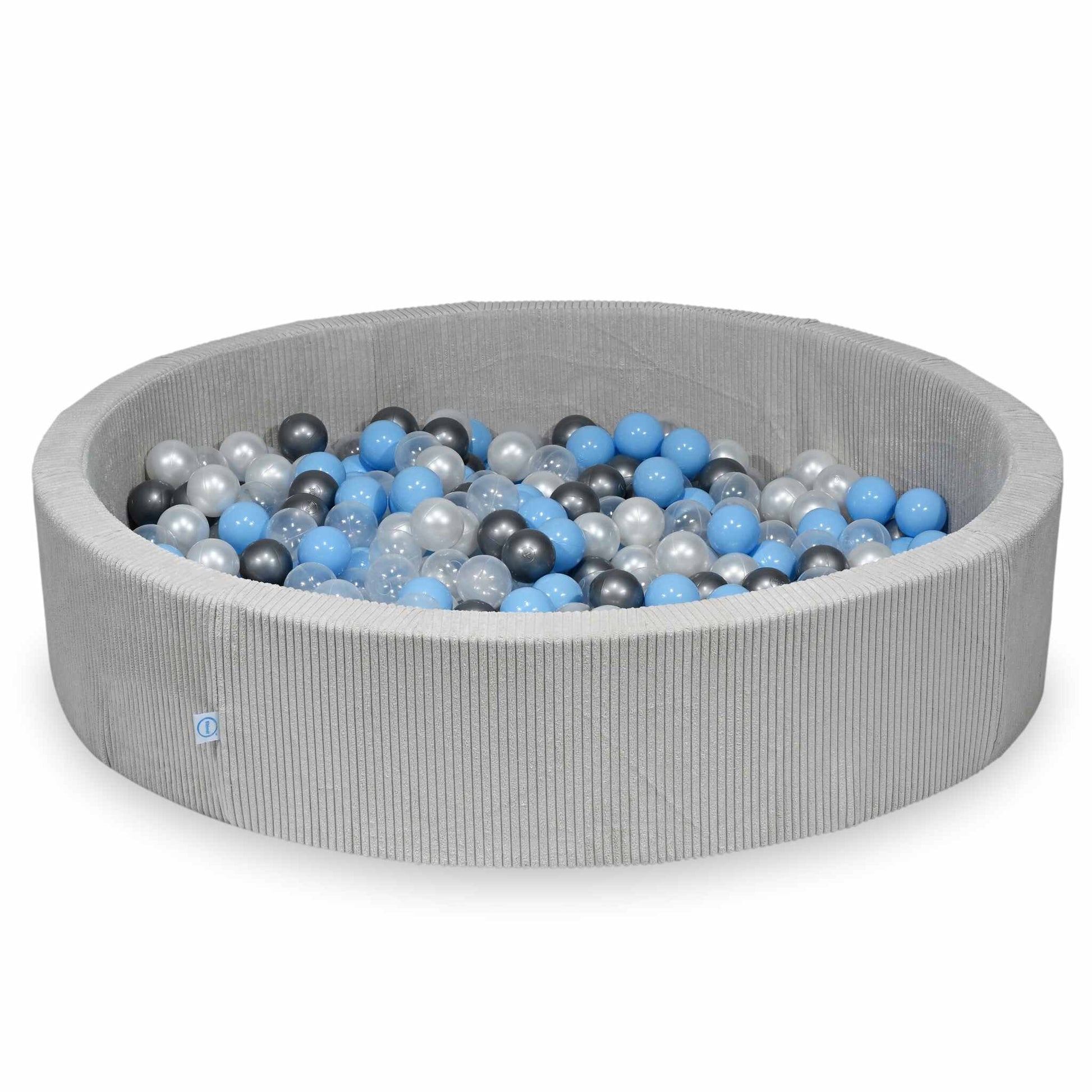 Piscine à balles ronde en velours côtelé gris, 130x30cm – 600 balls (transparent, nacré, argenté,bleu clair)