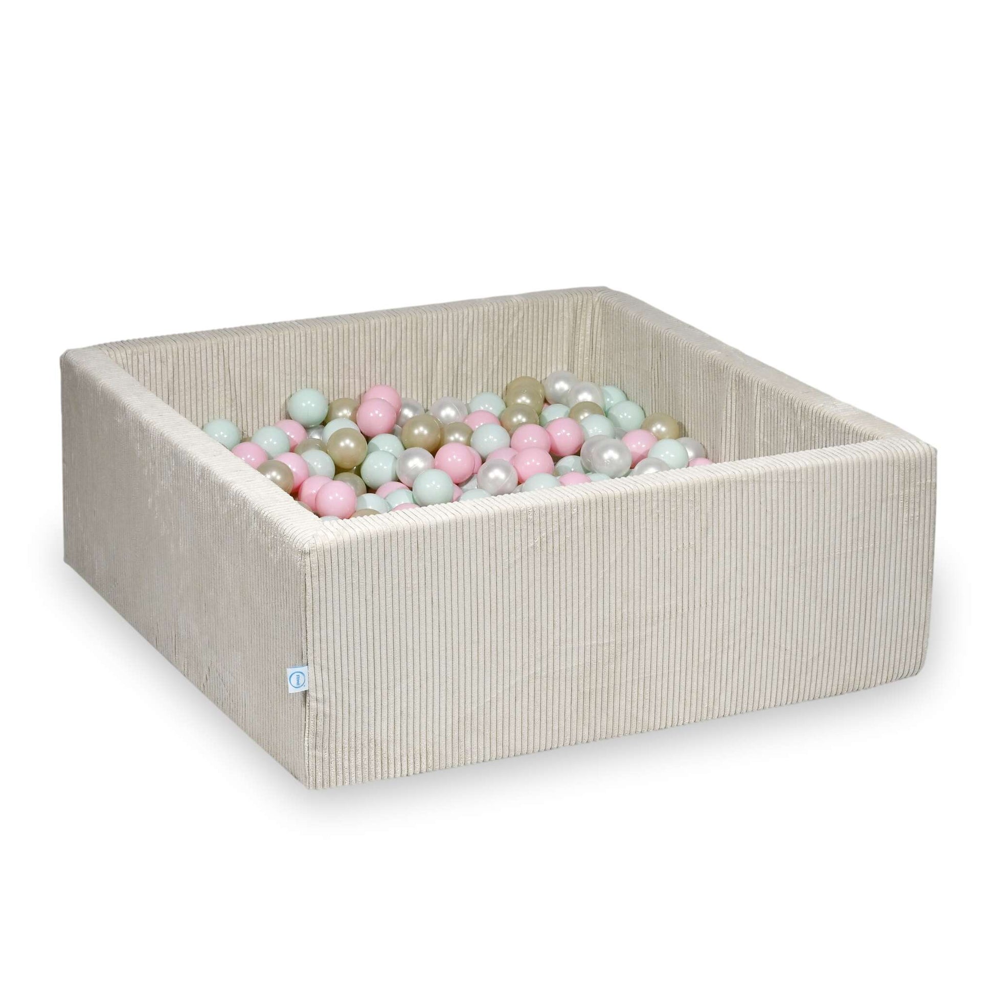 Piscine à balles square en velours côtelé beige, 110x110x40cm – Beige, 600 balls (nacrées, rose clair, vert menthe clair, or clair)