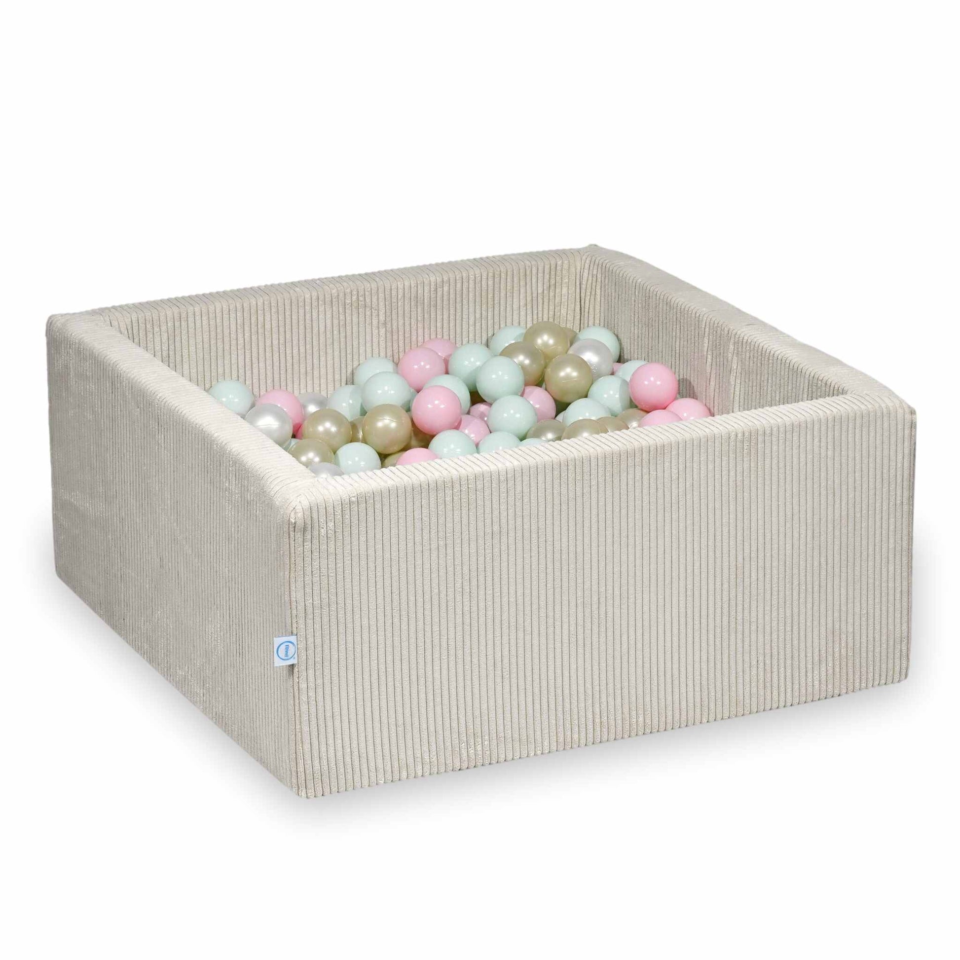 Piscine à balles square en velours côtelé beige, 90x90x40cm – Beige, 400 balls (nacrées, rose clair, vert menthe clair, or clair)