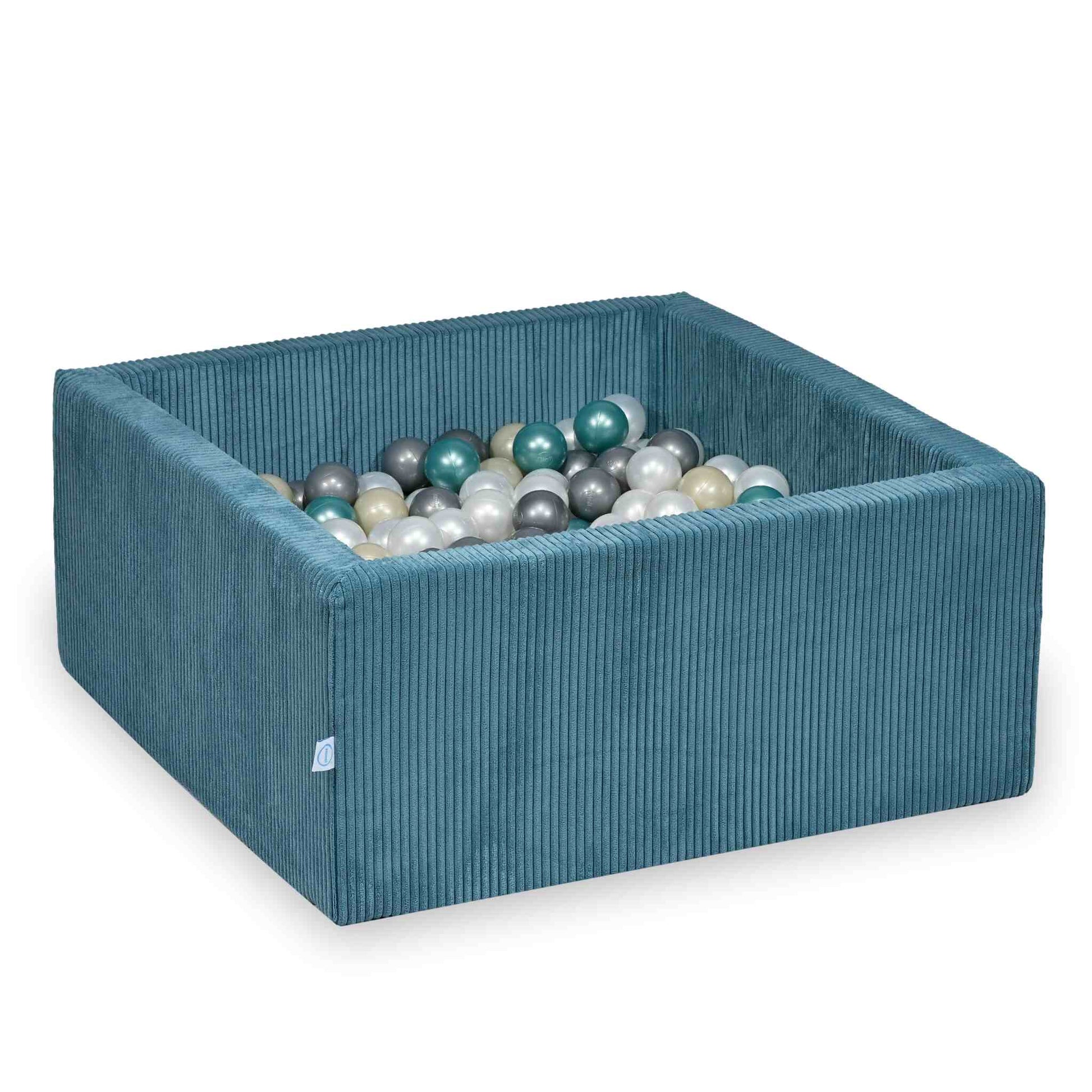 Piscine à balles square en velours côtelé bleu, 90x90x40cm – 400 balls (nacré, argenté, doré clair, turquoise métallisé)