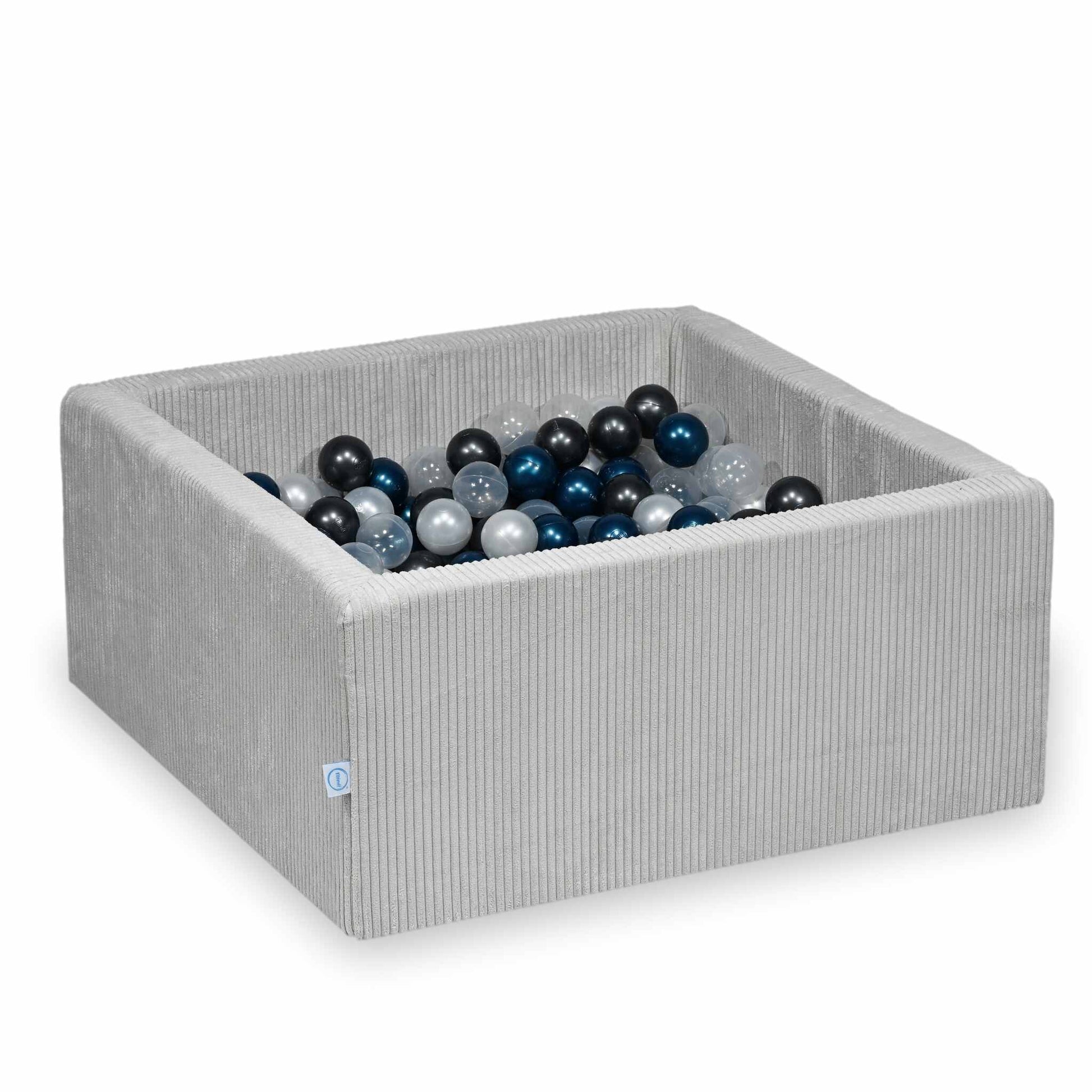 Piscine à balles square en velours côtelé gris, 90x90x40cm – 400 balls (transparent, nacré, graphite métallisé, bleu métallisé)